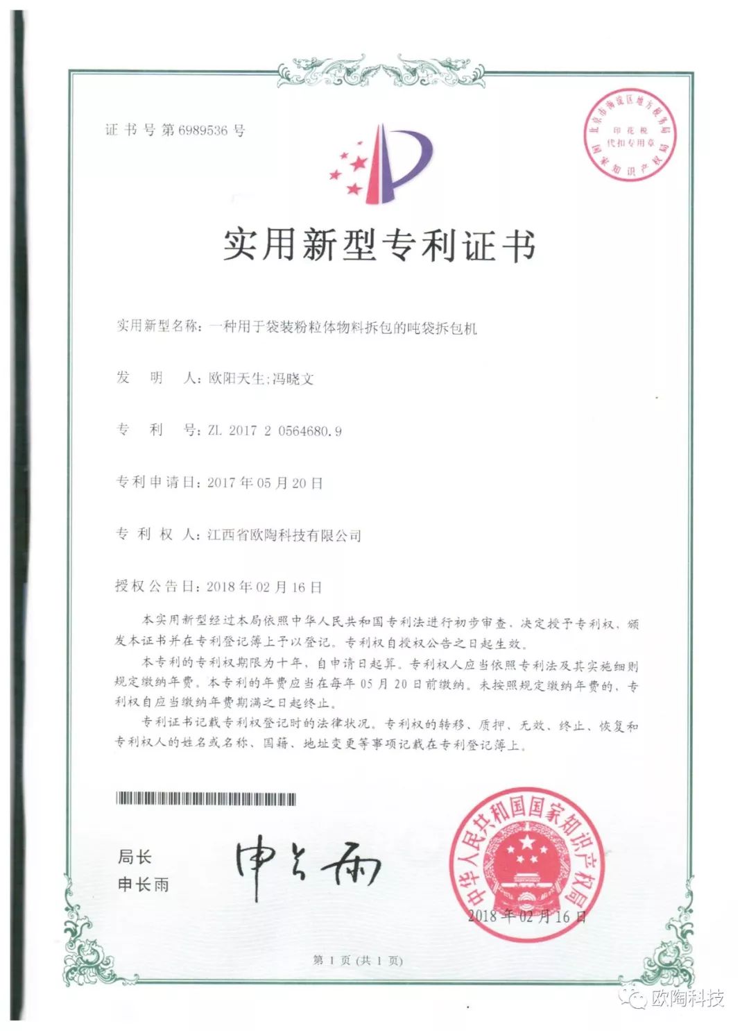 继2016年江西省欧陶科技有限公司、2017年肇庆市欧陶新型材料有限公司分别获得“国家高新技术企业”称号之后,2018新年伊始,欧陶科技科研工作又取得丰硕成果,江西省欧陶科技有限公司获得“江西省科技型中小微企业”和“宜春市优秀企业”称号,ZL.20170 2 0564680.9《一种用于袋装粉粒物料拆包的吨袋拆包机》获得国家知识产权局授权。